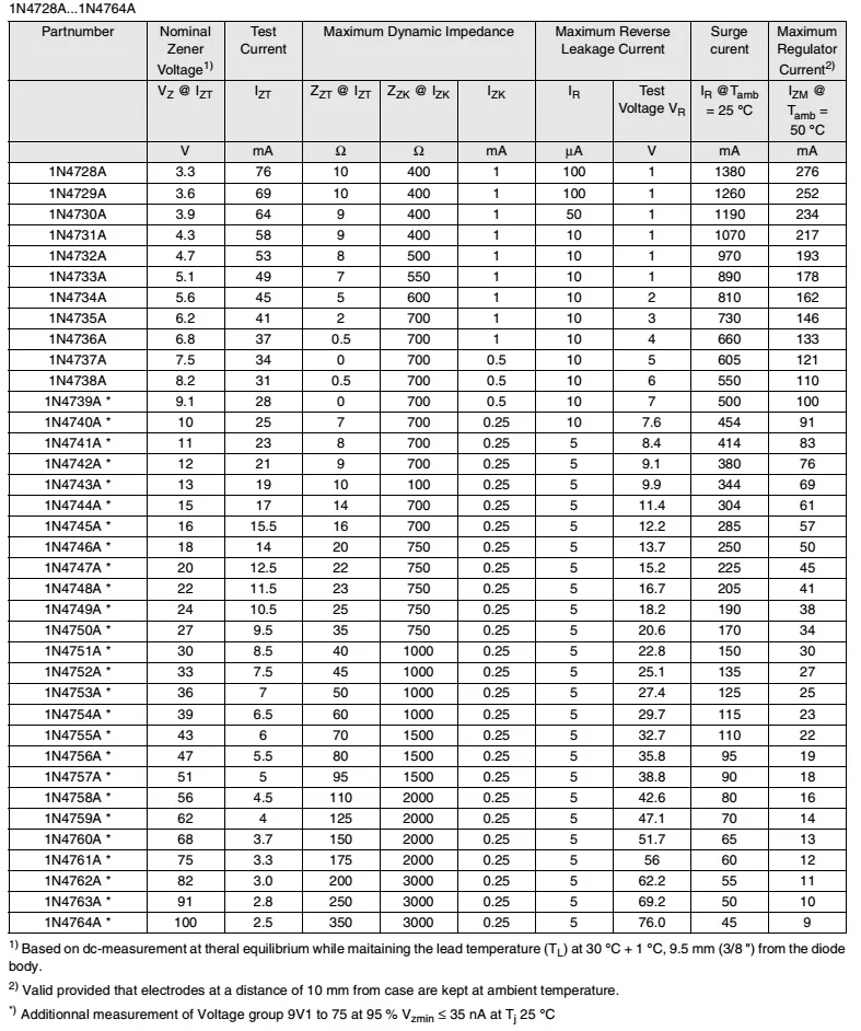 Bảng tra cứu mã và điện áp ổn định của diode zener từ 3.3V – 100V