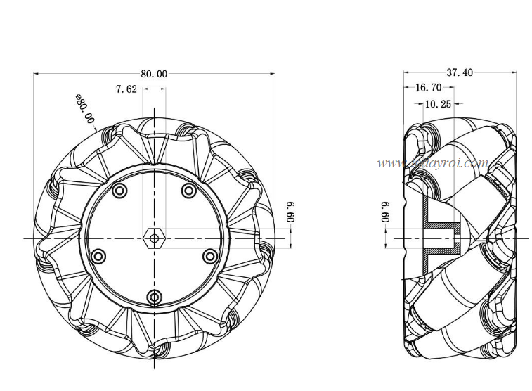 Bánh xe Mecanum là một thiết kế bánh xe đa hướng cho một phương tiện trên mặt đất di chuyển theo bất kỳ hướng nào, chẳng hạn như đi thẳng, xiên, ngang, S-line và xoay ở bất kỳ góc nào với bán kính bằng không. Với độ ồn khá thấp, loại bánh xe này có thể di chuyển ổn định và linh hoạt khi vận hành. Vì bánh xe dựa trên công nghệ truyền động đa hướng, người dùng có thể tự do điều khiển chiếc xe robot của mình ngay cả trong không gian chật hẹp. Bánh xe Mecanum này có đường kính 48mm và bao gồm 9 con lăn nhỏ được làm bằng nhựa và được bọc bằng cao su silicon chất lượng và ma sát cao, bền chắc và chống va đập.