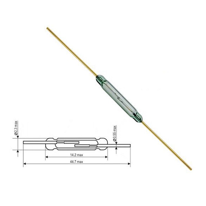 MKA14103 Công tắc từ thường mở 2x14mm, REED SWITCH, Công tắc thủy tinh, công tắc lưỡi gà.
