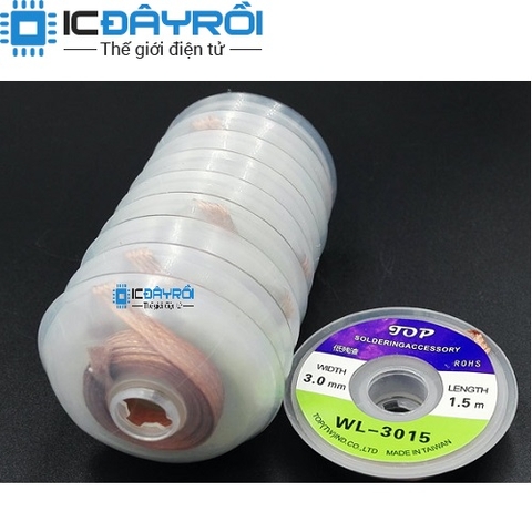 Dây hút chì WL-3015 là sản phẩm dùng để lấy chì ra khỏi chân linh kiện, giúp việc tháo gỡ linh kiện khỏi mạch dễ dàng hơn, Được đan từ nhiều sợi đồng nhỏ tạo thành bện dây đồng dẹt.