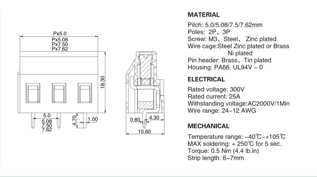 - Khoảng cách 2 chân liên tiếp: 5.0 mm