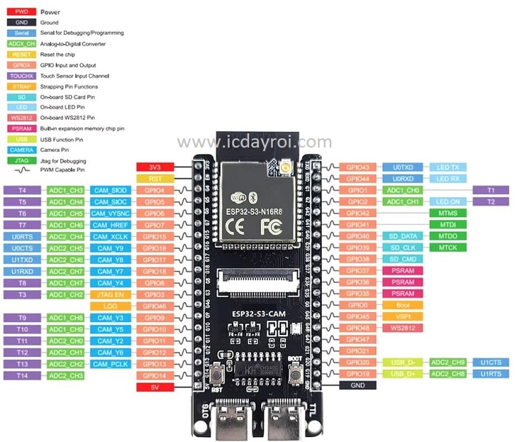 Goouuu ESP32-S3 là bảng phát triển IoT dựa trên Espressif Systems ESP32-S3-WROOM-1 N16R8. WIFI chính là Wi-Fi 2,4 GHz (802.11 b/g/n) + mô-đun Bluetooth® 5 (LE) được tích hợp sẵn. trong chip dòng ESP32- S3, bộ xử lý LX7 lõi kép 32 bit Xtensa®, Flash 16 MB, PSRAM lên đến 8 MB tùy chọn, 36 GPIO, ăng-ten PCB trên bo mạch ngoại vi phong phú.
