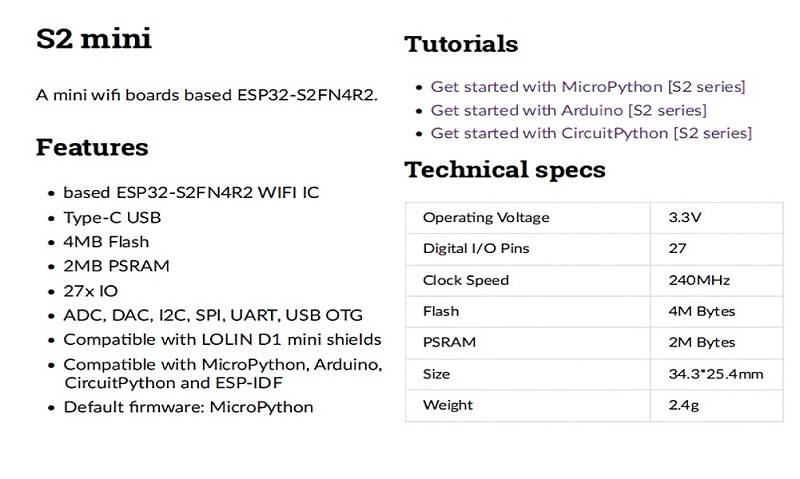 - - [Easy Integration]: The ESP32 S2 mini panel is compatible with a wide range of development platforms and programming languages, facilitating easy integration into existing projects and reducing development time.