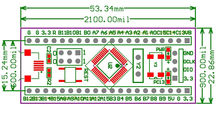 - Ra chân đầy đủ cho tất cả các GPIO và giao tiếp: CAN, I2C, SPI, UART/USART, USB