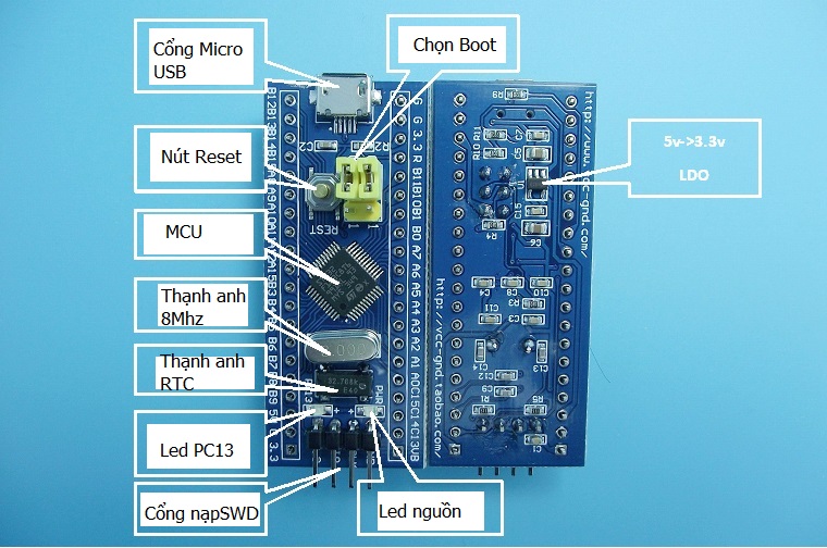 Kít thí nghiệm ARM STM32F103C8T6 nhỏ gọn, kít ra đầy đủ chân của vi điều khiển, có cổng giao tiếp USB và cổng nạp SWD