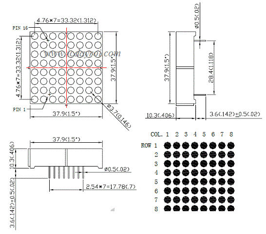 Led Matrix 1588BS Led matrix 8x8 F3.75mm (1588 - 38x38mm), Red, Anode