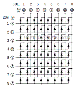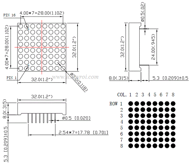 Led Matrix HSN-1088BS RED, 8x8 LED Matrix, Dot size: 3mm, Size: 32x32mm, Anode