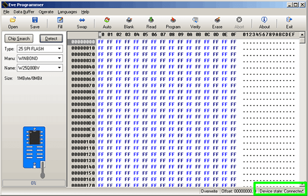 – Kiểm tra lại bằng cách thực thi Flash_Programmer.exe, khi kết nối mạch nạp CH341 với máy tính sẽ thông báo Device state: Connected.