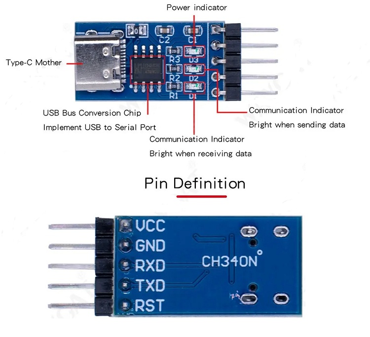 This product is a TypeC to TTL serial port module that uses a CH340N USB bus adapter chip