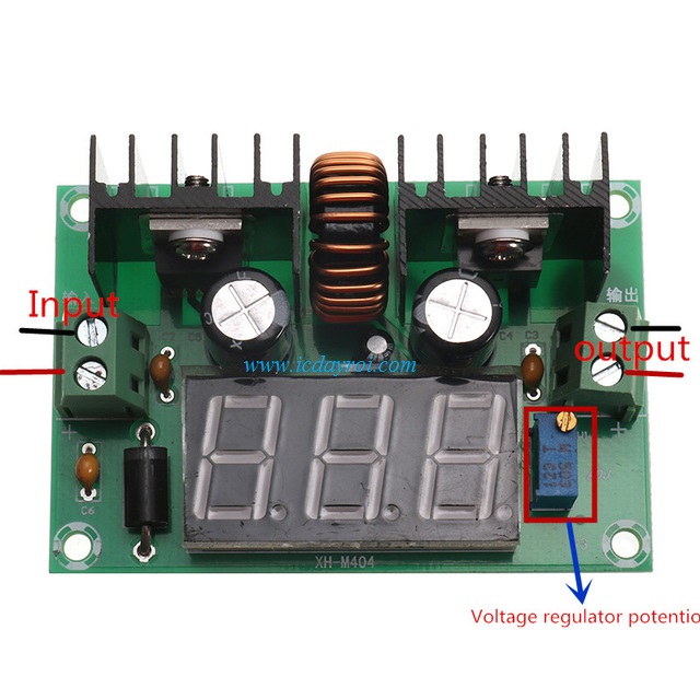 Điện áp ngõ ra được điều chỉnh bằng chiết áp và hiển thị điện áp ngõ ra bằng led 7 đoạn tích hợp trên mạch.