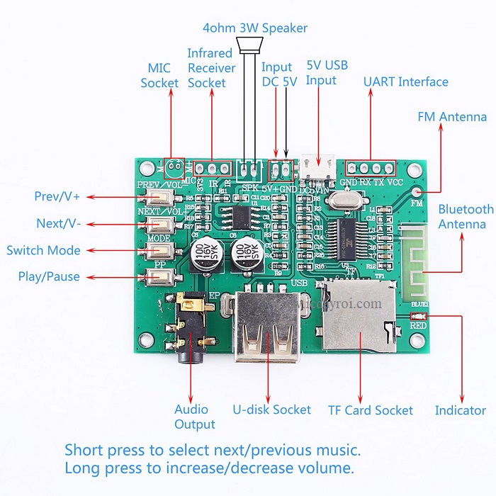 - + Hỗ trợ cuộc gọi qua blueooth, các nút nhấn điều khiển đa năng, bài nhạc cuối cùng đang phát, lặp lại, phát/tạm dừng. điều chỉnh âm lượng và các chức năng đơn giản khác
