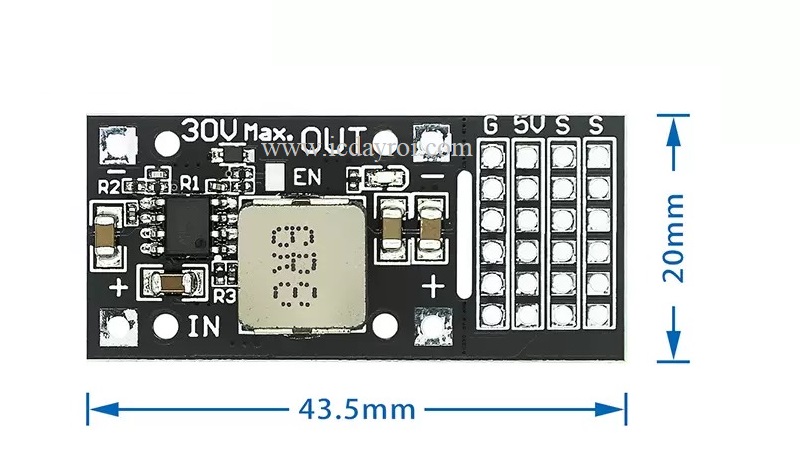- Điện áp đầu vào: 7 – 30VDC (khuyến nghị dưới 24V)