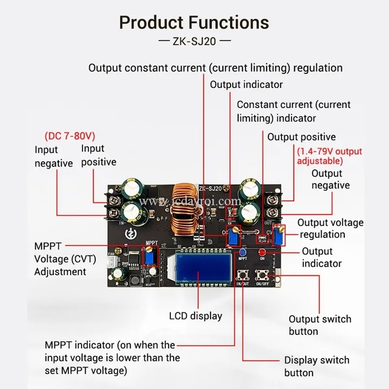 - - Dải Điện Áp Đầu Vào Rộng: Hỗ trợ điện áp đầu vào từ 8V đến 60V, với đầu ra có thể điều chỉnh từ 1.4V đến 79V, mang đến sự linh hoạt cho các nhu cầu khác nhau.