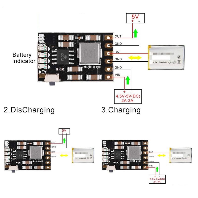 Trên module có tích hợp LEDs báo dung lượng pin và báo sạc. Nút nhấn kích hoạt module hoạt động hoặc tắt. Cho phép vừa sạc vừa cung cấp điện ở ngõ ra.