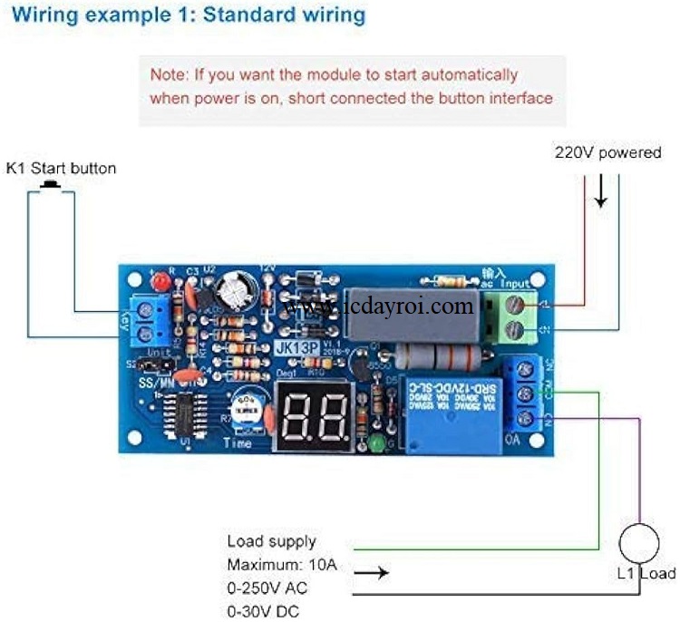 - Khi kích hoạt bắt đầu đếm ngược, relay ngay lập tức được đóng. Và relay hở sau khi kết thúc đếm ngược.
