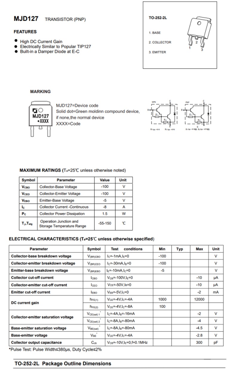 MJD127 TRANSISTOR PNP TO-252-2 8A 100V