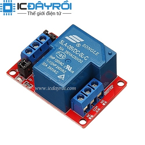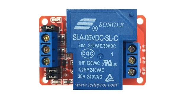 Module 1 Relay 5V 30A với opto cách ly nhỏ gọn, có opto và transistor cách ly giúp cho việc sử dụng trở nên an toàn với board mạch chính, mạch được sử dụng để đóng ngắt nguồn điện công suất cao AC hoặc DC với dòng lên đến 30A, thích hợp với đóng ngắt các thiết bị lớn như motor (khoảng 1/2HP) , dàn đèn điện, máy móc tầm trung,...có thể chọn đóng khi kích mức cao hoặc mức thấp bằng Jumper. Tiếp điểm đóng ngắt gồm 3 tiếp điểm NC (thường đóng), NO(thường mở) và COM(chân chung) được cách ly hoàn toàn với board mạch chính, ở trạng thái bình thường chưa kích NC sẽ nối với COM, khi có trạng thái kích COM sẽ chuyển sang nối với NO và mất kết nối với NC.