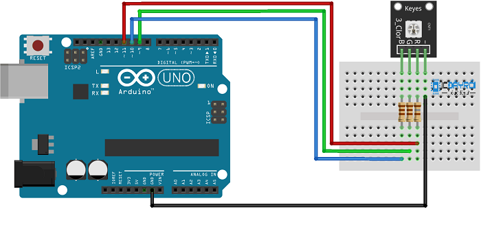 Module sử dụng LED 3 màu RGB (đỏ/xanh dương/ xanh lá). Có thể phối hợp màu sắc bằng cách điểu chỉnh pwm cho từng màu.