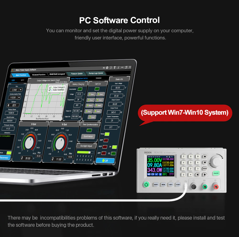 Điều chỉnh điện áp lên tới 60V 18A, có thể update firmware và theo dõi thông số trên máy tính
