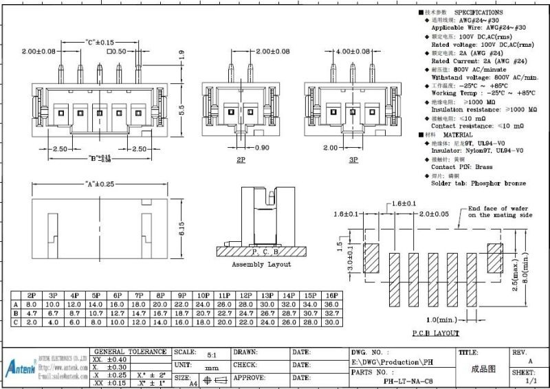 PH2.0-2P-2.0mm đực thẳng, 2Pin, kích thước giữa các chân 2.0MM