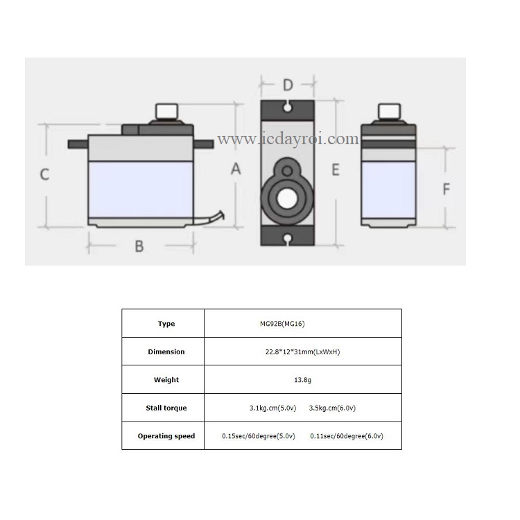 Stall torque: 3.1kg/cm (5.0v); 3.5kg/cm (6.0v)