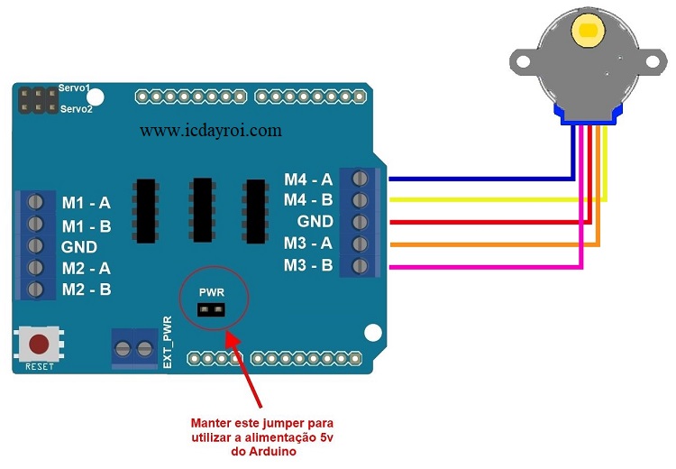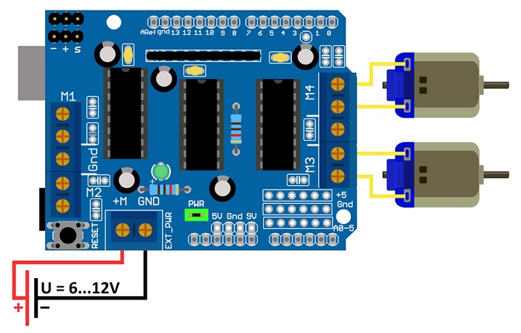 Trên Shield có 1 jump màu vàng PWR được sử dụng: Nếu kết nối nguồn ngoài cho board Arduino thông qua Jack DC (vd pin 9V) thì nguồn nuôi motor được lấy luôn từ jack này, không cần nối nguồn với EXT_PWR. Nếu ngắt jumper, bạn cần nối nguồn riêng vào EXT_PWR để nuôi Motor.