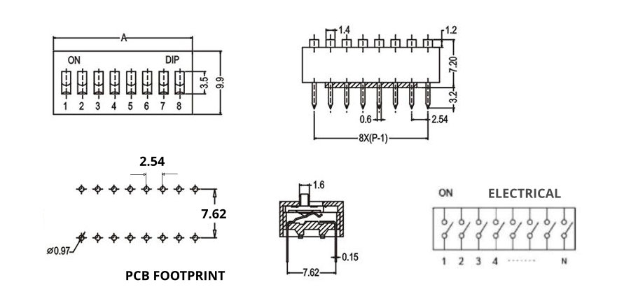 These DIP switch has 8 individual switch positions. The pins have 2.54mm spacing, fits great into a breadboard and works as general control switches when multiple switch or conditions are required.